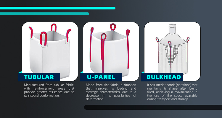 Κατασκευασμένα από υφαντές ταινίες πολυπροπυλενίου υψηλής αντοχής και αντοχής, σχεδιασμένες να συγκρατούν φορτία από 300 έως 2500 Kg, παρουσιάζονται στην πιο ποικιλία μοντέλων: Tubular, Flat, U-Panel, με διαφράγματα, One Loop, μεταξύ άλλων.Κάθε ένα από αυτά τα σχέδια επιτρέπει εναλλακτικούς συνδυασμούς, λαμβάνοντας υπόψη τις απαιτήσεις του πελάτη όσον αφορά την ικανότητα φόρτωσης, τον τύπο φόρτωσης και εκφόρτωσης, τα συστήματα ανύψωσης κ.λπ.